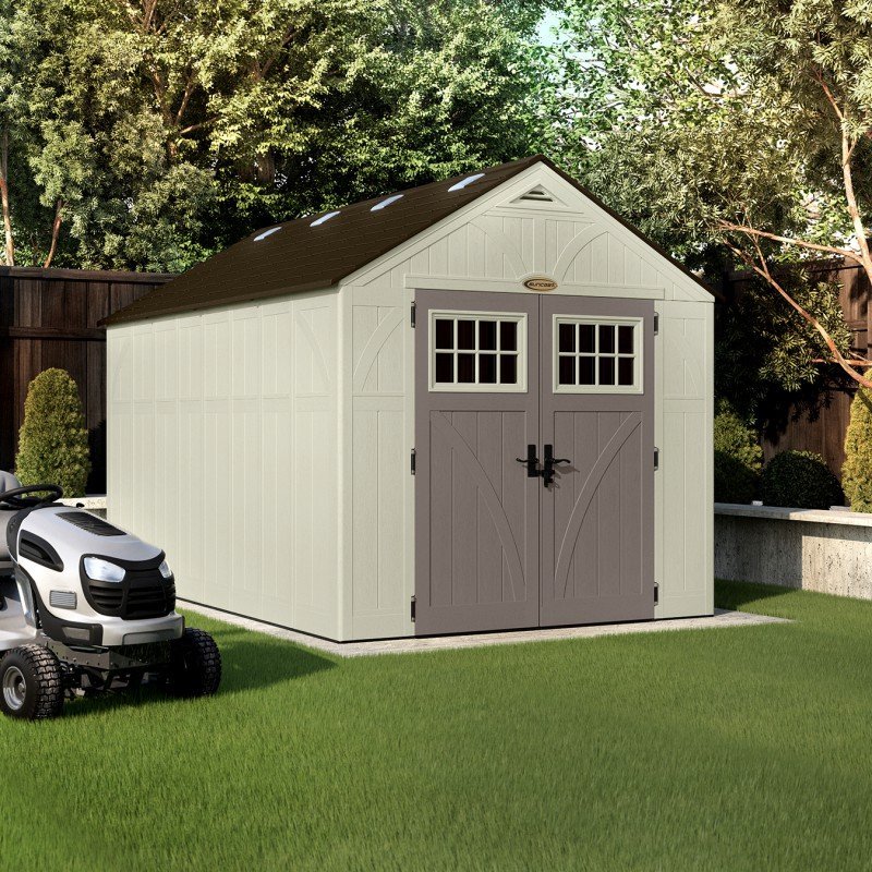 En plus d’être résistant, l’abri en PE Suncast est particulièrement joli. La granularité du polyéthylène lui donne un aspect bois et les tons utilisés sont à la mode. Le gris clair et le gris taupé s’intègrent parfaitement dans des jardins contemporains.