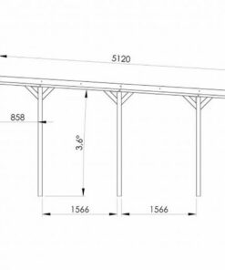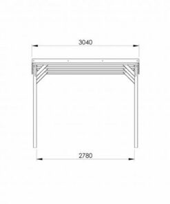 Carport JEAN 1 voiture en pin FSC traité autoclave vert. Couverture en PVC. 6 poteaux de sections en 9 x 9 cm. Largueur de passage utile : 2,78m. Largueur entre les poteaux latéraux : 1,57m. Quincaillerie fournie avec vis de charpente. Supports de poteaux à sceller en option. Hauteurs intérieures : 2,34 à 2,03m. Surface utile : 14,2m² – Surface hors tout : 15,5m². Dimensions hors-tout : L.304 x P.512 x H.252
