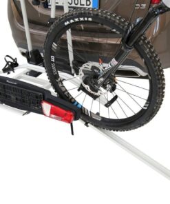 Il s’installe sur une boule d’attelage et se fixe sur le cadre et la roue arrière du vélo. Il est équipé d’un système d’antivol sur chaque bras. Sa rampe d’accès permet de monter aisément les vélos électriques. Il est facilement inclinable grâce à une large pédale.
