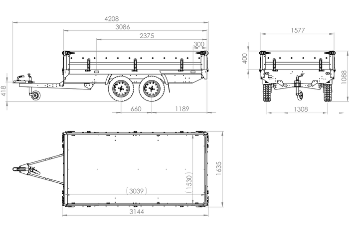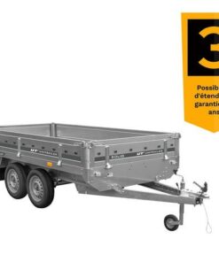 Remorque 2 essieux UNITRAILER SOLID 300/2 avec PTAC jusqu’à 750 kg. Extrêmement pratique grâce à la possibilité d’ouvrir ou de démonter toutes les ridelles, ce qui permet un chargement extrêmement facile ! Nous effectuons pour vous toutes les formalités.