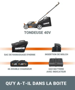 La tondeuse à gazon assure une tonte nette et rapide grâce à sa largeur de coupe de 40cm et ses 2 batteries 20V.