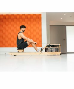 Rameur VR3 Pure Design Fitness by WaterRower à résistance à eau, siège et repose pieds ergonomiques, structure solide en chêne, double rail, silencieux, compatible Kinomap et applications IOS et Android, stockage vertical et roulettes de transport à l’avant.